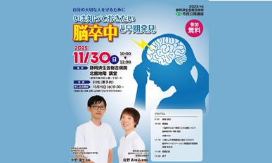 受付時間休診日 ・受付時間 8:00〜11:00 ・休診日 土・日曜日・祝日・年末年始 予約受診の方は、予約時間前に受付をお願いします。 外来担当医表外来担当医・休診情報 救命救急センター受診のご案内 交通アクセス 詳しくはこちら 電車・バスでお越しの方 お車でお越しの方 タクシーでお越しの方 MAP 〒422-8527 静岡県静岡市駿河区小鹿1-1-1大きな地図で見る お知らせInformation PICKUP 病院からのお知らせ イベント 情報公開 病院発行コンテンツ 採用情報 健康管理センター 病院発行コンテンツ NEW 2025.10.08 Home vol.53を公開しました。 病院からのお知らせ NEW 2025.10.07 スマートフォンのマイナ保険証利用について 病院からのお知らせ NEW 2025.10.01 第3回市民公開講座のご案内 病院からのお知らせ NEW 2025.09.22 インフルエンザ予防接種のお知らせ 病院からのお知らせ NEW 2025.09.22 2025年10月外来担当医表 採用情報 NEW 2025.09.19 療育センター令和 事務員 (有期) 採用情報 NEW 2025.09.11 臨床検査技師(2026新卒・第二新卒・正規)募集 イベント NEW 2025.09.10 世界アルツハイマーデーライトアップイベント 病院からのお知らせ NEW 2025.10.07 スマートフォンのマイナ保険証利用について 病院からのお知らせ NEW 2025.10.01 第3回市民公開講座のご案内 病院からのお知らせ NEW 2025.09.22 インフルエンザ予防接種のお知らせ 病院からのお知らせ NEW 2025.09.22 2025年10月外来担当医表 病院からのお知らせ 2025.09.03 「みんなの夢を叶えたい」プロジェクト始動! 病院からのお知らせ 2025.09.03 済生会フェアのダイジェスト動画を公開しました 病院からのお知らせ 2025.08.07 8月10日は健康ハートの日 病院からのお知らせ 2025.07.29 「指定暑熱避難施設(クーリングシェルター)」に指定されました 病院からのお知らせ 2025.07.25 【メディア掲載】岡本好史病院長インタビュー 病院からのお知らせ 2025.07.22 公式キャラクターの名前が決定しました 病院からのお知らせ 2025.07.10 院内デイケアを始めました 病院からのお知らせ 2025.07.08 【メディア掲載】泌尿器科 木村亮輔 医師 イベント NEW 2025.09.10 世界アルツハイマーデーライトアップイベント イベント 2025.09.08 「静岡コピー大賞」課題提供のお知らせ イベント 2025.07.16 腎臓病教室のご案内 イベント 2025.06.30 【イベントレポート】済生会フェア’25 開催報告 ~インクルーシブ社会実現のために地域をつなぐ医療と福祉~ イベント 2025.05.20 済生会フェア’25 当日のご案内 イベント 2025.04.28 糖尿病講座のご案内(有度生涯学習交流館) イベント 2025.04.22 療育講座まねぇぶ令和7年度の予定 イベント 2025.03.30 就労支援相談会(毎月第3金曜日開催) イベント 2025.01.17 済生会フェア開催決定 イベント 2025.01.17 【イベントレポート】輪島塗チャリティ販売会 イベント 2024.12.24 【イベントレポート】クリスマスコンサート2024 イベント 2024.12.05 【イベントレポート】リレー・フォー・ライフ2024静岡 病院発行コンテンツ NEW 2025.10.08 Home vol.53を公開しました。 病院発行コンテンツ 2025.07.29 home vol.52:DOCTOR'S VOICE 「目指すのは骨折を防ぐこと」 病院発行コンテンツ 2025.07.29 home vol.52:はじめよう!コツコツ「骨活(ほねかつ)」【運動編】 病院発行コンテンツ 2025.07.29 home vol.52:はじめよう!コツコツ「骨活(ほねかつ)」【栄養編】 病院発行コンテンツ 2025.07.29 home vol.52:骨折を引き起こす「骨粗しょう症」にご用心 病院発行コンテンツ 2025.07.29 home vol.52:「骨卒中」で生活が激変!? 病院発行コンテンツ 2025.07.03 Home vol.52を公開しました。 病院発行コンテンツ 2025.06.26 メディア掲載情報更新しました 病院発行コンテンツ 2025.05.15 home vol.51:【Doctor Profile】呼吸器外科 科長 高橋耕治 病院発行コンテンツ 2025.05.15 home vol.51:【Doctor Profile】呼吸器内科 部長 池田政輝 病院発行コンテンツ 2025.05.15 home vol.51:【静岡済生会の肺がん治療3】肺がんトータルケア 病院発行コンテンツ 2025.05.15 home vol.51:【静岡済生会の肺がん治療2】呼吸器内科・外科の連携 採用情報 NEW 2025.09.19 療育センター令和 事務員 (有期) 採用情報 NEW 2025.09.11 臨床検査技師(2026新卒・第二新卒・正規)募集 採用情報 NEW 2025.09.10 保育士(中途・正規)募集 採用情報 2025.08.29 なでしこ保育園 放課後児童クラブ支援員(有期)募集 採用情報 2025.08.28 作業療法士(中途・正規)募集 採用情報 2025.08.05 調理補助員(盛付・配膳)(有期)募集 採用情報 2025.08.01 ジョブコーチ(有期)募集 採用情報 2025.07.14 言語聴覚士インターンシップ開催 採用情報 2025.07.09 看護補助者の動画公開中!(静岡県看護協会) 採用情報 2025.07.01 特定技能外国人交流会を開催しました 採用情報 2025.06.12 療育センター令和 言語聴覚士(中途・正規)募集 採用情報 2025.06.12 療育センター令和 言語聴覚士(新卒・正規)募集 健康管理センター 2025.03.03 健康管理センターだより15号発行 健康管理センター 2025.02.10 クレジットカード決済をご利用の方へ 健康管理センター 2025.01.30 駐車場工事のお知らせ 健康管理センター 2024.12.12 健診料金改定のお知らせ 健康管理センター 2024.11.20 2024年12月以降の保険証資格確認に