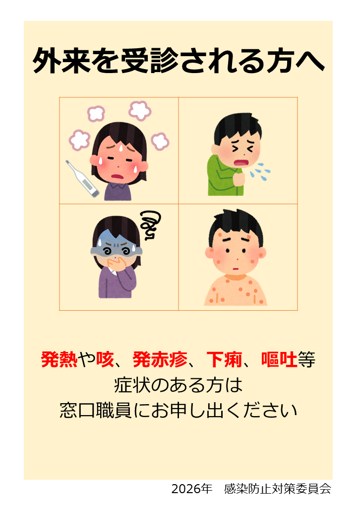 発熱や咳、発疹、下痢、嘔吐などの症状がある方は、ご来院時に窓口職員へお申し出ください。