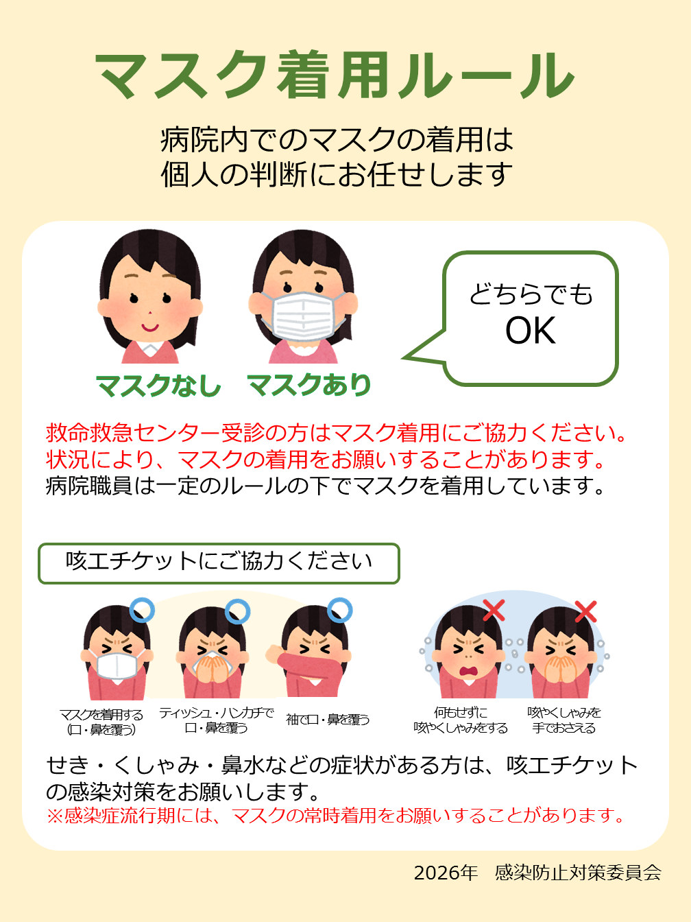 当院では、院内でのマスク着用について運用を見直し、現在は原則として個人の判断にお任せしております。
